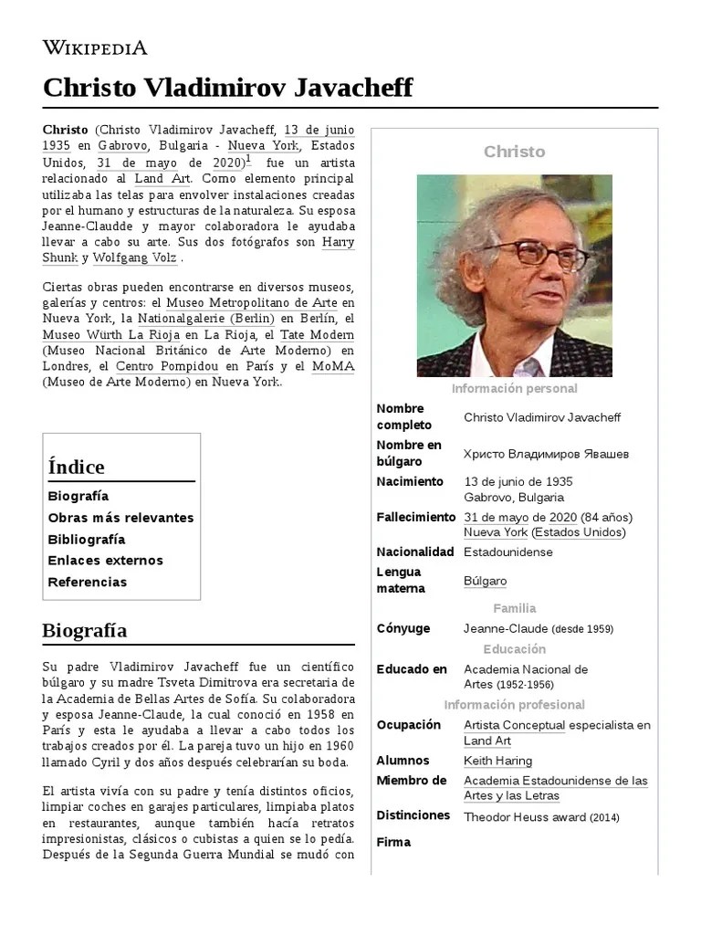 El mismo día que la que sería su mujer y socia en el mundo del arte:.. El mismo día que la que sería su mujer y socia en el mundo del arte: Christo christo javacheff (gabrovo, bulgaria, 1935) artista estadounidense de origen búlgaro. Jeanne claude denat nacque lo stesso giorno dello stesso anno, a casablanca, da una famiglia militare Christo era hijo de una familia de la élite búlgara.. Desde su temprana juventud mostró un gran interés por el arte, lo que le llevó a matricularse, a los dieciséis años de edad, en la academia de bellas artes de sofía.